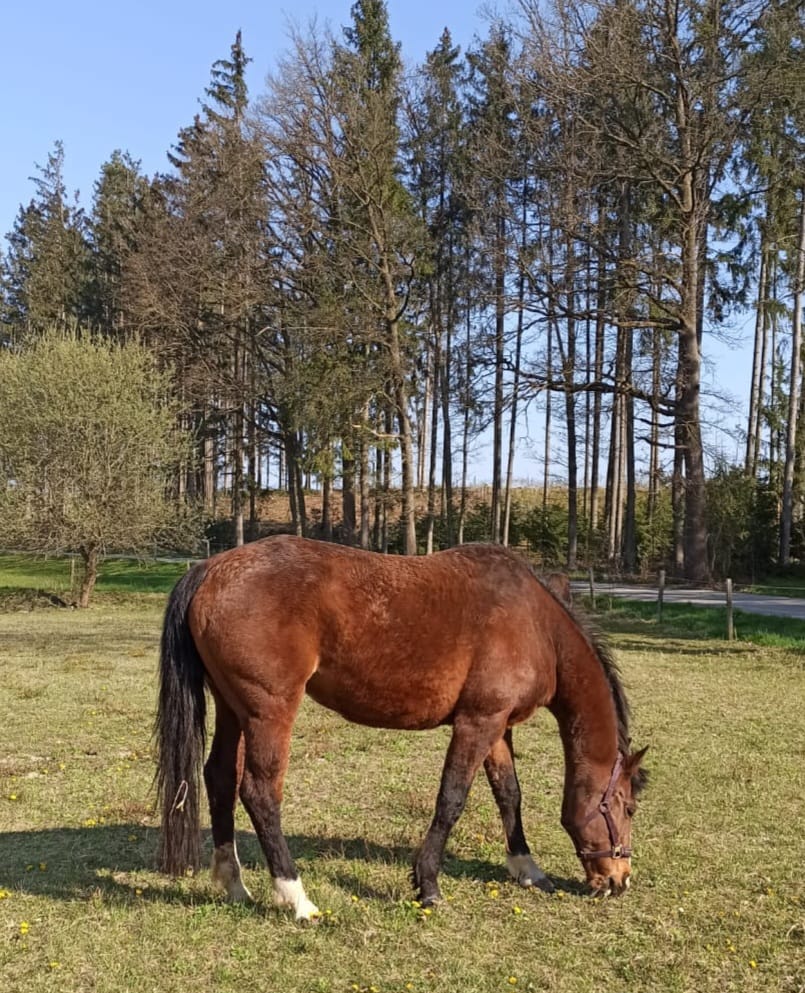 Vor vier Jahren sind meine 21 jährige ehemalige Spring-Stute Tamy, mit schwerem Cushing und Fesselträgerschaden zu Astrid ins Pferdeparadies Miethal gezogen. Wir kamen aus einer Haltung die für ein altes Pferd mit speziellen Anforderungen nicht geeignet war.